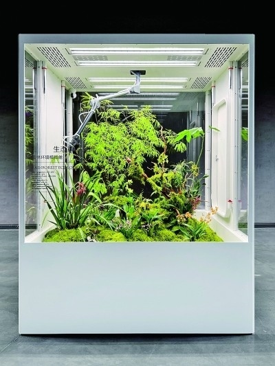展廳一側(cè),三個立方體環(huán)境模擬艙并排放置,分別在近7立方米的空間內(nèi)模擬了雨林、海島、沙漠三種生態(tài)環(huán)境,引來許多觀眾圍觀?!霸诟邩橇至⒌亩际?,很多人都向往擁有一方屬于自己的自然天地。為人們在室內(nèi)打造一片‘原始森林’便成了我們的使命?!逼放苿?chuàng)始人李軍介紹,設(shè)計過程中,團(tuán)隊遇到的一大的難點就是在保證室內(nèi)環(huán)境舒適度的同時,讓各類植物健康生長?!巴ㄟ^設(shè)計師的努力,我們首次將人造太陽光源、溫濕度控制、空氣流通、智能微噴等系統(tǒng)整合于室內(nèi)種植模擬環(huán)境中,實現(xiàn)了室內(nèi)種植智能化、自動化、現(xiàn)代化?!崩钴姳硎荆鲈O(shè)計亦要遵循自然法則,“人與自然和諧共生”是團(tuán)隊始終不變的設(shè)計宗旨。
