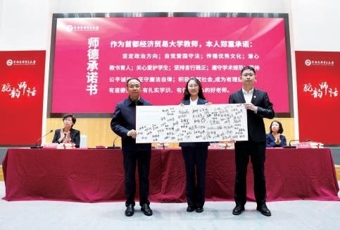在加強(qiáng)思想政治建設(shè)方面,抓好思政課改革創(chuàng)新,在市屬高校率先全面開設(shè)“習(xí)近平新時(shí)代中國特色社會主義思想概論”課,獲批北京市首批重點(diǎn)建設(shè)馬克思主義學(xué)院。持續(xù)開展課程思政建設(shè),得到市委教育工委的肯定性評價(jià)。聯(lián)動社會大課堂,成立大學(xué)生思想政治教育中心,與北大紅樓、中國人民抗日戰(zhàn)爭紀(jì)念館、長辛店二七紀(jì)念館等單位共建一批“大思政課”實(shí)踐教學(xué)基地。堅(jiān)持“五育并舉”,促進(jìn)學(xué)生全面發(fā)展。五年多來,學(xué)校獲評多項(xiàng)教育部和北京市課程思政建設(shè)獎項(xiàng)、北京高校“三全育人”優(yōu)秀成果、北京高?!笆演o導(dǎo)員”等榮譽(yù)。一批學(xué)生在文體比賽中獲省部級及以上獎勵,展現(xiàn)出新時(shí)代首經(jīng)貿(mào)學(xué)子的良好風(fēng)貌。