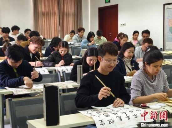 4月3日,在北京華文學(xué)院學(xué)習(xí)的泰國(guó)學(xué)員在上書(shū)法課。(中新網(wǎng)記者韓輝 攝)