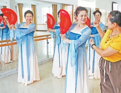 內(nèi)蒙古自治區(qū)呼倫貝爾市扎蘭屯市老年活動中心,幾名學(xué)員在老年大學(xué)上舞蹈課。韓穎群攝(影像中國)