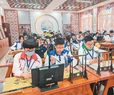 | 5月7日,參加“寧夏歷史文化、自然資源與環(huán)境保育探索之旅”交流活動的香港中學生在寧夏銀川市第六中學學寫毛筆字。新華社記者 艾福梅攝 |