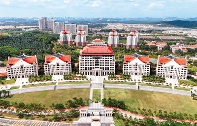 碧空悠悠,湖水如鏡。西洋風(fēng)格搭配閩南傳統(tǒng)燕尾脊屋頂?shù)慕ㄖ溆谑[翠之中,陳嘉庚雕塑在晨光中投下長長的影子,學(xué)生們邁著輕快的步伐趕往教室。廈門大學(xué)馬來西亞分校(簡稱“廈大馬?!保┑那宄砍錆M生機(jī)。如今,這所高等學(xué)府成為中馬高等教育合作的旗艦項(xiàng)目。