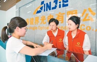 圖為近日,蒙山鎮(zhèn)黨員志愿者來到鏡界光電有限公司宣傳人才政策,指導(dǎo)企業(yè)申報相關(guān)人才項(xiàng)目。