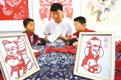 山東高密姜莊鎮(zhèn)產(chǎn)學(xué)研實(shí)踐基地內(nèi),非遺傳承人指導(dǎo)小朋友剪紙。李海濤攝(人民圖片)