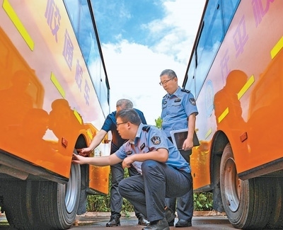 新學(xué)期開學(xué)在即,為保障學(xué)生乘車安全,各地組織開展校車安全專項檢查,對校車安全性能、司機駕駛資格以及隨車配備的安全應(yīng)急器材等進行檢查,及時排除隱患。圖為8月27日,山東省聊城市茌平區(qū)交警在檢查溫陳街道的校車。