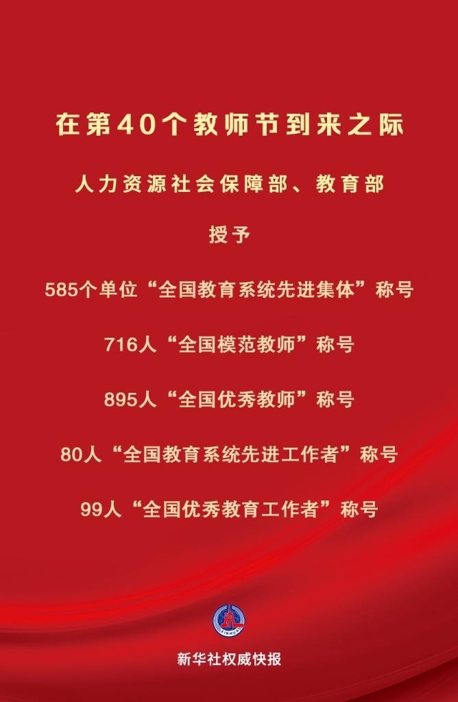 在中華人民共和國成立75周年和第40個(gè)教師節(jié)到來之際,為大力弘揚(yáng)教育家精神,營造全社會(huì)尊師重教濃厚氛圍,激勵(lì)全國廣大教師和教育工作者落實(shí)立德樹人根本任務(wù),積極投身教育強(qiáng)國建設(shè),人力資源社會(huì)保障部、教育部決定授予中央財(cái)經(jīng)大學(xué)金融學(xué)院等585個(gè)單位“全國教育系統(tǒng)先進(jìn)集體”稱號;授予刁榮春等716名同志“全國模范教師”稱號;授予于淵等895名同志“全國優(yōu)秀教師”稱號;授予王彥平等80名同志“全國教育系統(tǒng)先進(jìn)工作者”稱號;授予王軍等99名同志“全國優(yōu)秀教育工作者”稱號。