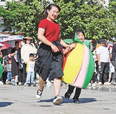 福建泉州安溪縣第十四幼兒園,家長與孩子參加親子體育活動。豐曉飛攝(人民視覺)