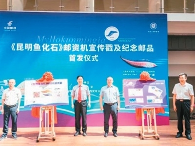 2023年5月,《昆明魚(yú)化石》郵資機(jī)宣傳戳及系列紀(jì)念郵品在西北大學(xué)博物館首發(fā)。此次啟用的《昆明魚(yú)化石》郵資機(jī)宣傳戳,是以中國(guó)科學(xué)院院士、西北大學(xué)教授舒德干團(tuán)隊(duì)發(fā)現(xiàn)的鳳姣昆明魚(yú)化石為原型設(shè)計(jì)制作。鳳姣昆明魚(yú)距今已5.18億年,是已知最古老的脊椎動(dòng)物。該魚(yú)的發(fā)現(xiàn),為揭示寒武紀(jì)大爆發(fā)奧秘、破解遠(yuǎn)古生命演化謎團(tuán)提供了獨(dú)特的劃時(shí)代里程碑證據(jù)。圖為首發(fā)儀式現(xiàn)場(chǎng)。中新社發(fā)