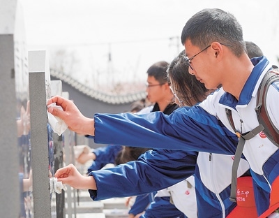 2024年4月3日,學(xué)生在任山河烈士陵園擦拭烈士墓碑。