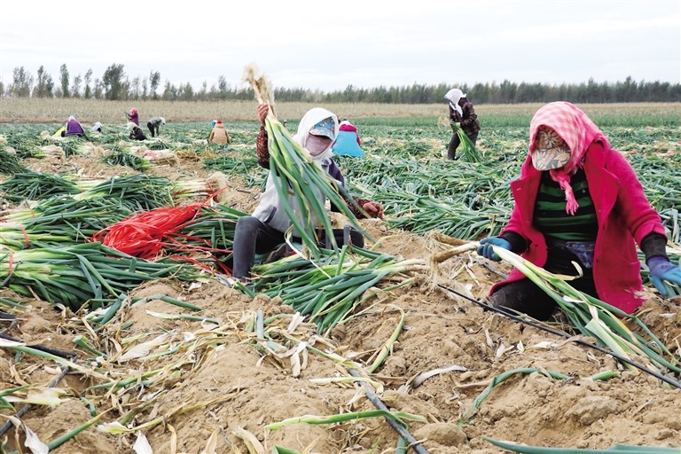 正在忙著收蔥打捆的村民于新穎說(shuō):“看這蔥長(zhǎng)得多好!”