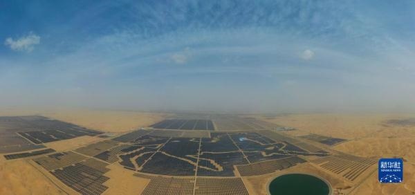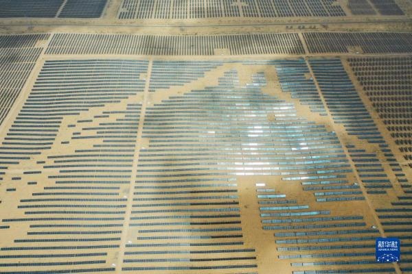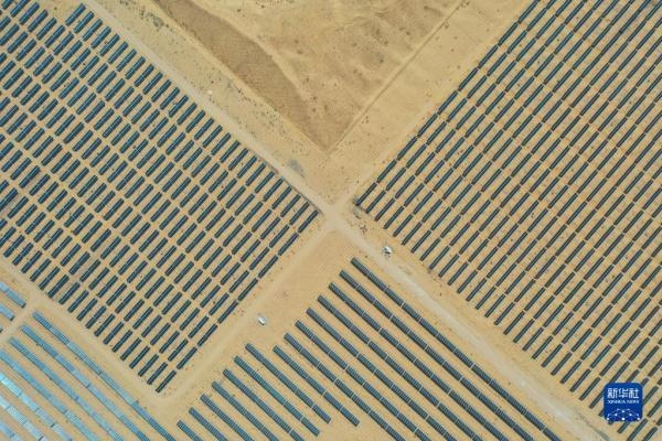 一匹占地130多萬平方米的沙漠“駿馬”橫臥在內(nèi)蒙古自治區(qū)庫布其沙漠之中,這是位于達(dá)拉特光伏發(fā)電應(yīng)用領(lǐng)跑基地中、由近20萬塊光伏板組成的“駿馬電站”。該電站采用“林光互補”模式,板上發(fā)電、板下種植,在開發(fā)利用庫布其沙漠豐富太陽能資源的同時,推動沙漠生態(tài)治理。