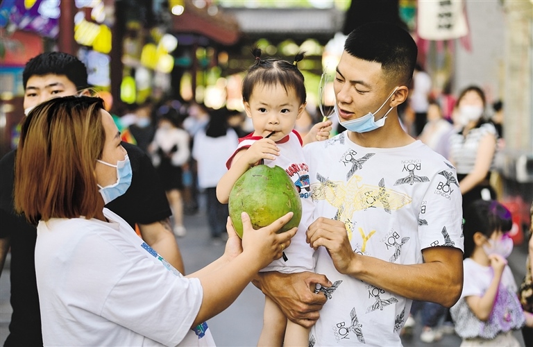 6月18日,呼和浩特市民在玉泉區(qū)通順大巷小吃街上品嘗椰子汁。當(dāng)日,2022年塞上老街音樂(lè)美食季在呼和浩特市玉泉區(qū)開(kāi)幕。今年的音樂(lè)美食季活動(dòng)共分為阿拉坦汗廣場(chǎng)、大召前街等六大活動(dòng)區(qū)塊,推出啤酒節(jié)、美食季、快閃店、后備箱集市等八大主題活動(dòng),助力首府夜經(jīng)濟(jì)發(fā)展、夜消費(fèi)繁榮,活動(dòng)將持續(xù)到9月底。(記者 王磊 攝)