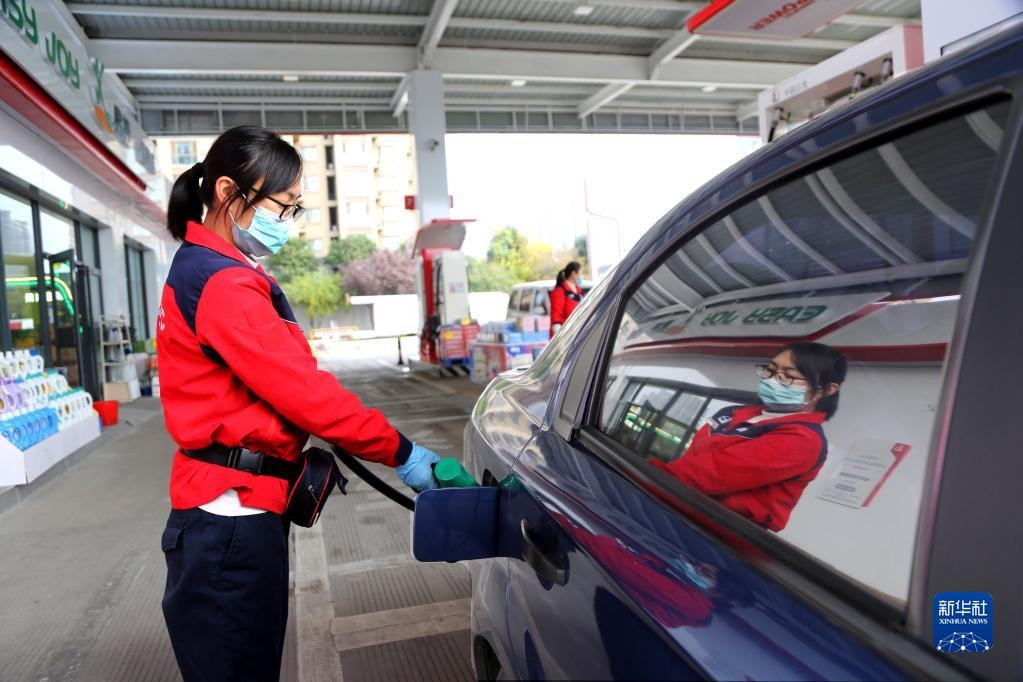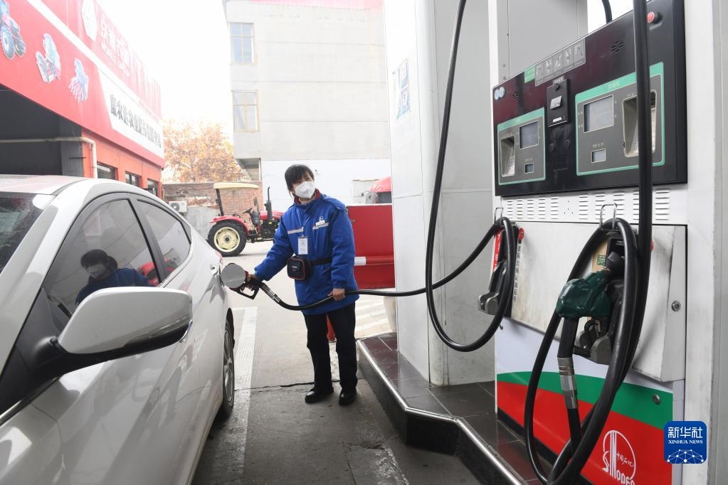 11月21日,在江蘇省連云港市連云區(qū)一加油站,工作人員給汽車加油。新華社發(fā)(王春 攝)