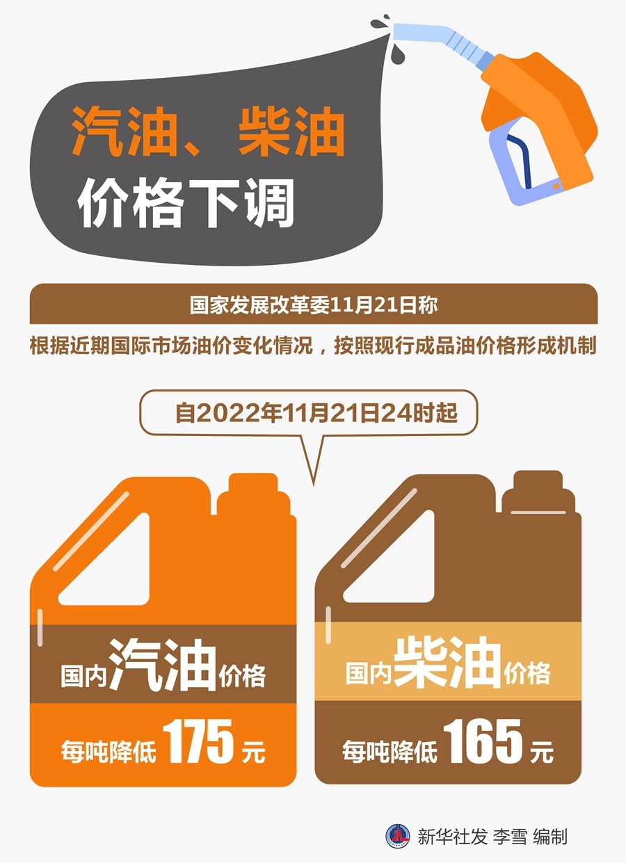 國家發(fā)展改革委21日稱,根據(jù)近期國際市場油價變化情況,按照現(xiàn)行成品油價格形成機制,自2022年11月21日24時起,國內汽油、柴油價格每噸分別降低175元和165元。