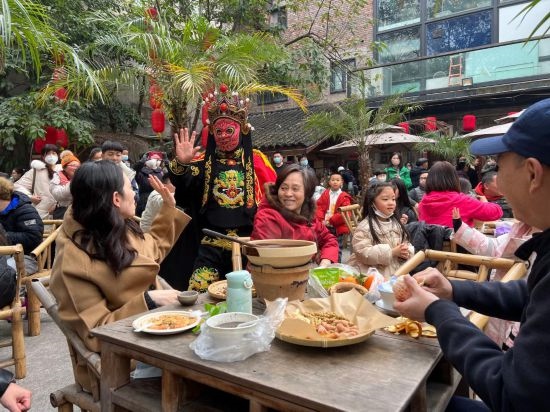 春節(jié)期間,重慶市渝中區(qū)山城巷中,“山城壩壩”茶館的院壩內(nèi)坐滿了客人。人們一邊圍爐煮茶,一邊欣賞臺上的傳統(tǒng)藝術表演,川劇變臉演員剎那間切換臉譜,贏得滿堂喝彩。老板舒蓉熱情招呼著客人,將茶水、點心端到桌上,忙得不亦樂乎?!敖衲甏汗?jié)的客流量遠超預期,營業(yè)額是去年同期的七八倍?!?/p>