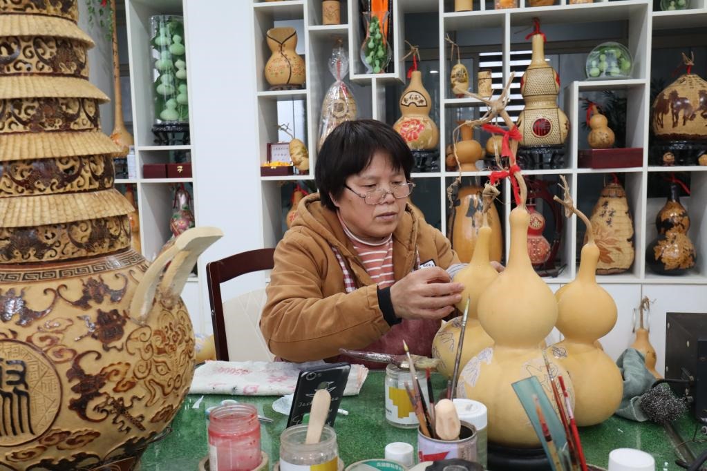 記者在一處加工點看到,今年41歲的村民李三紅正在趕制一批刻有“吉祥如意”字眼的葫蘆。李三紅10多年前從零開始學習烙刻葫蘆,現(xiàn)已成為技術骨干?!白鲆粋€葫蘆能掙六七十塊錢,抓緊點一天能做三個?!崩钊t說。