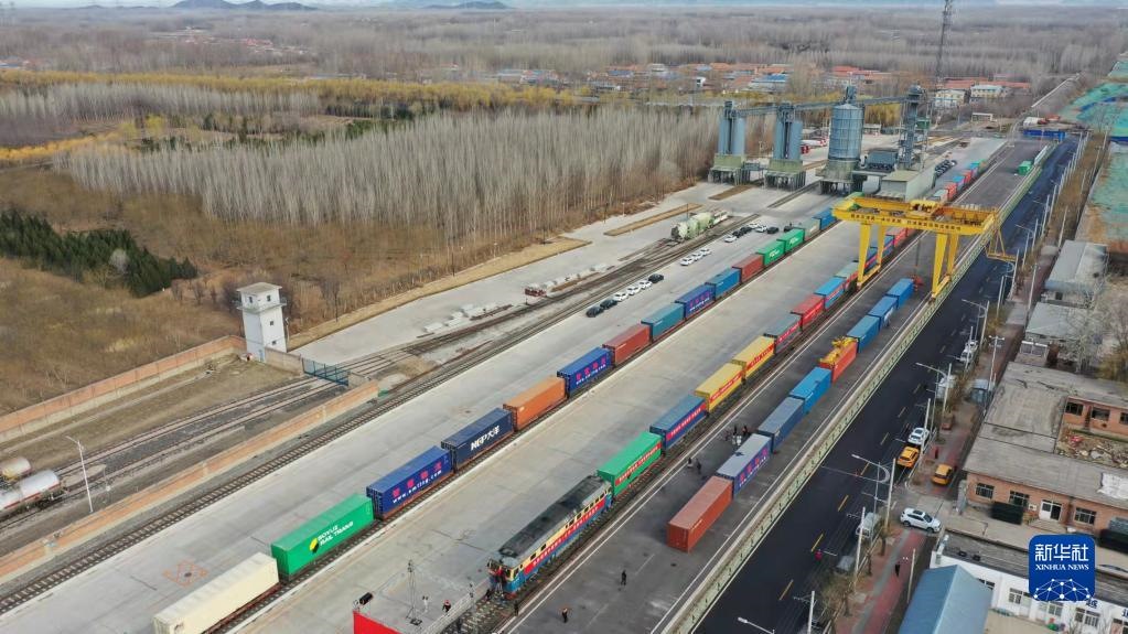 3月16日,在平谷地方鐵路馬坊站,京平綜合物流樞紐中歐班列(北京-莫斯科)停靠在站臺(無人機(jī)照片)。新華社發(fā)