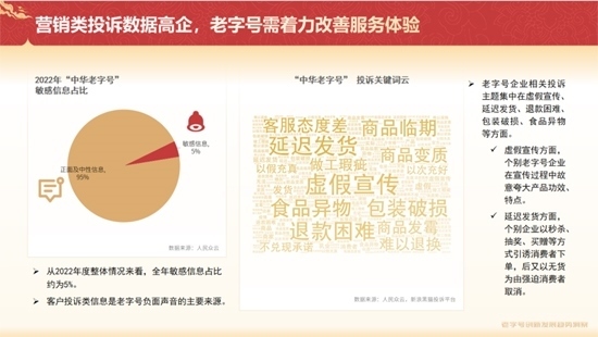 《報(bào)告》同時(shí)指出,在消費(fèi)者側(cè),客戶(hù)投訴類(lèi)信息是老字號(hào)負(fù)面聲音的主要來(lái)源,老字號(hào)企業(yè)相關(guān)投訴主題集中在虛假宣傳、延遲發(fā)貨、退款困難、包裝破損、食品異物等方面。這些問(wèn)題不僅影響了消費(fèi)者體驗(yàn),也不利于企業(yè)自身保持優(yōu)質(zhì)的聲譽(yù)形象。