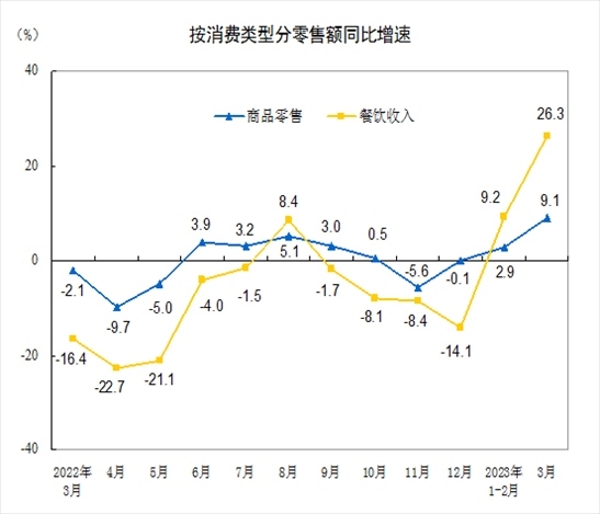 按消費類型分,3月份,商品零售34148億元,同比增長9.1%;餐飲收入3707億元,增長26.3%。1—3月份,商品零售102786億元,同比增長4.9%;餐飲收入12136億元,增長13.9%。