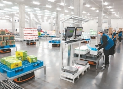 2月27日,在湖北省襄陽市好鄰居生鮮物流中心,機器人根據(jù)工作人員指令穿梭于貨架之間,自動分揀蔬菜、水果等生鮮產品。楊 東攝(人民視覺)