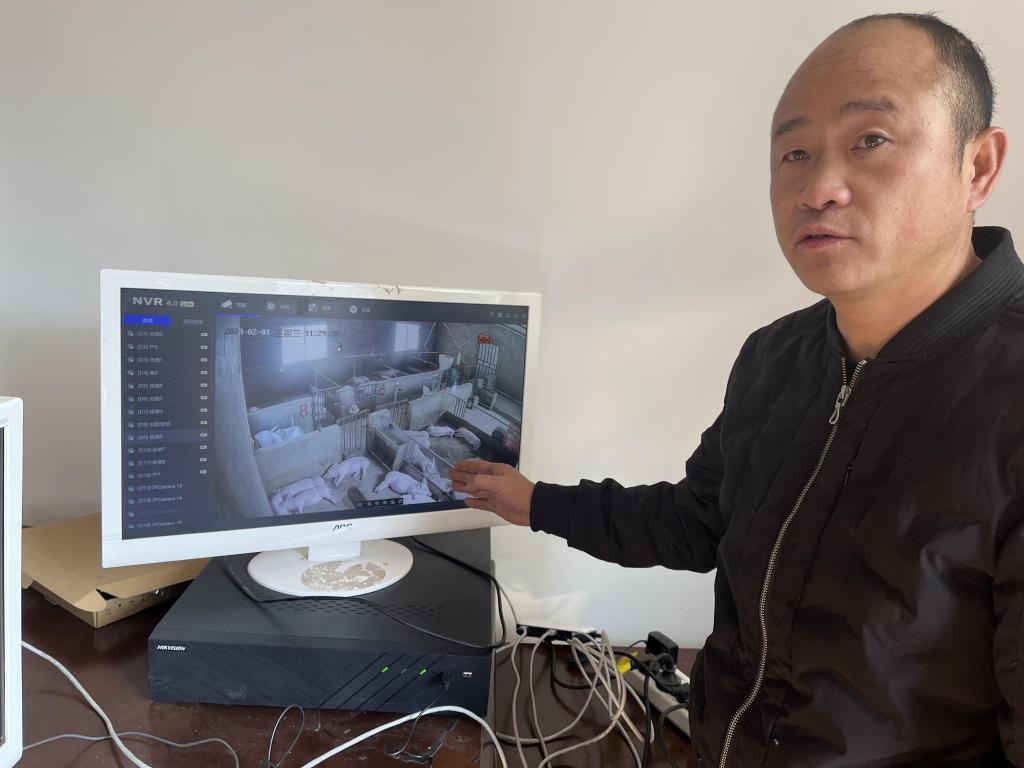 圖為2023年2月1日拍攝的何西康通過(guò)線上視頻監(jiān)控平臺(tái)查看豬崽生長(zhǎng)情況。新華社記者 李驚亞 攝