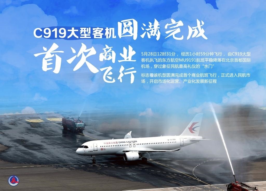 5月28日12時31分,經(jīng)歷1小時59分鐘飛行,由C919大型客機(jī)執(zhí)飛的東方航空MU9191航班平穩(wěn)降落在北京首都國際機(jī)場,穿過象征民航最高禮儀的“水門”,標(biāo)志著該機(jī)型圓滿完成首個商業(yè)航班飛行,正式進(jìn)入民航市場,開啟市場化運營、產(chǎn)業(yè)化發(fā)展新征程。新華社發(fā)