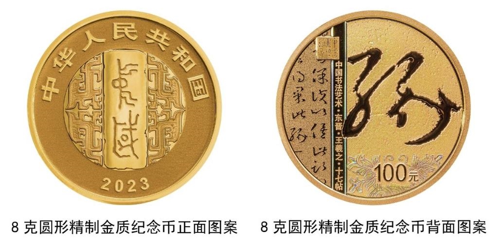 8克圓形金質(zhì)紀(jì)念幣背面圖案為東晉王羲之書《十七帖》局部文字及“緣”字樣與裝飾紋樣、“中國(guó)書法藝術(shù)”篆刻鈐印等組合設(shè)計(jì),并刊“中國(guó)書法藝術(shù)·東晉·王羲之·十七帖”字樣及面額。