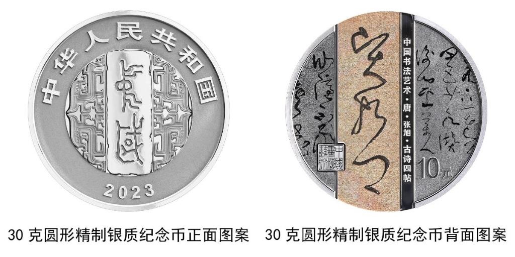 30克圓形銀質(zhì)紀(jì)念幣背面圖案為唐代張旭書《古詩(shī)四帖》局部文字及“賢哲”字樣與“中國(guó)書法藝術(shù)”篆刻鈐印等組合設(shè)計(jì),并刊“中國(guó)書法藝術(shù)·唐·張旭·古詩(shī)四帖”字樣及面額。