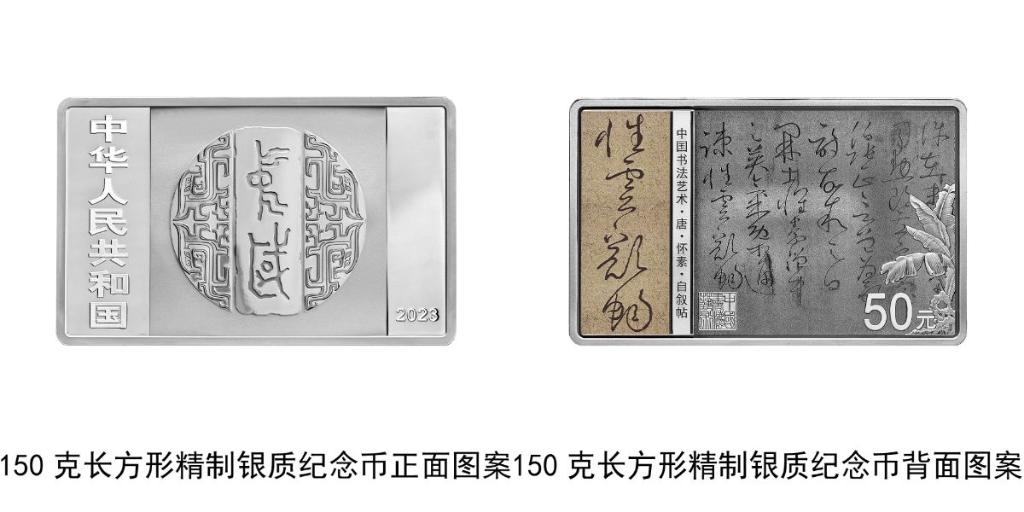 150克長(zhǎng)方形銀質(zhì)紀(jì)念幣背面圖案為唐代懷素書《自敘帖》局部文字及“性靈豁暢”字樣與芭蕉、石頭、“中國(guó)書法藝術(shù)”篆刻鈐印等組合設(shè)計(jì),并刊“中國(guó)書法藝術(shù)·唐·懷素·自敘帖”字樣及面額。