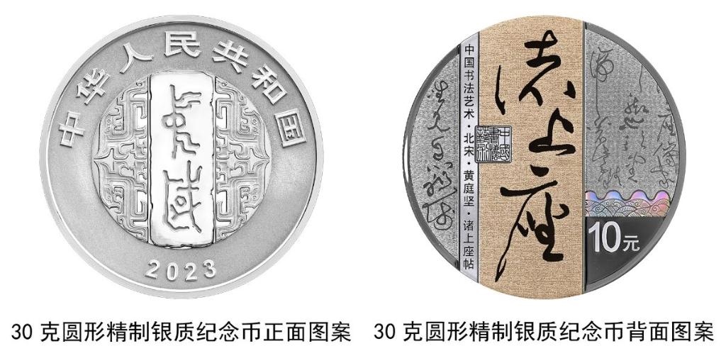 30克圓形銀質(zhì)紀(jì)念幣背面圖案為北宋黃庭堅(jiān)書《諸上座帖》局部文字及“諸上座”字樣與筆架、“中國(guó)書法藝術(shù)”篆刻鈐印等組合設(shè)計(jì),并刊“中國(guó)書法藝術(shù)·北宋·黃庭堅(jiān)·諸上座帖”字樣及面額。