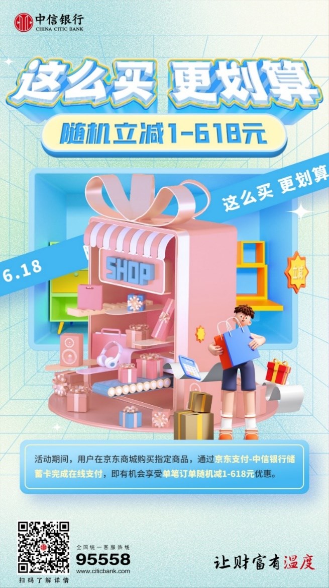 “618”作為年度消費盛宴的重要節(jié)日,抖音、京東等各大電商均在積極行動,加大優(yōu)惠力度。中信銀行借記卡以“618促消費”為抓手,充分發(fā)揮借記卡產(chǎn)品在電商消費支付環(huán)節(jié)的作用,推出系列支付優(yōu)惠活動,讓用戶在開心消費的同時買得更便宜,享受真實惠。