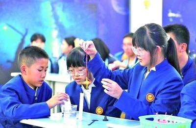 在內蒙古阿拉善盟額濟納旗地面課堂,學生在做趣味實驗。新華社發(fā)