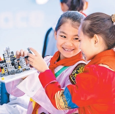 內蒙古呼和浩特市,小學生在校學習組裝機器人。丁根厚攝(影像中國)