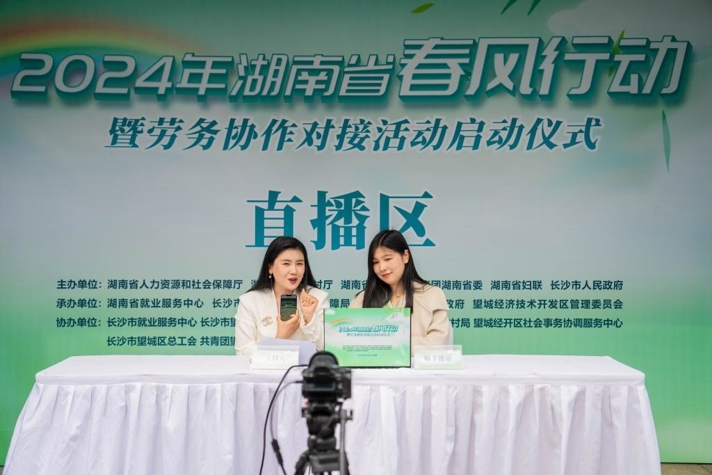 2月19日,在湖南省長沙市望城區(qū)市民廣場,工作人員在“春風行動”招聘活動上通過網(wǎng)絡(luò)直播推薦工作崗位。新華社記者 陳思汗 攝