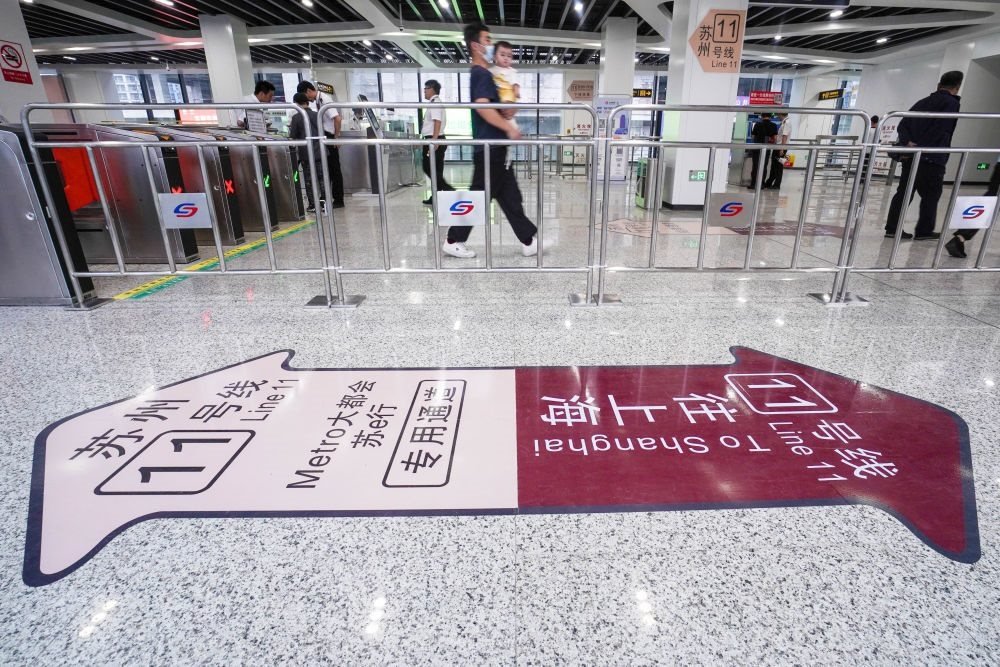 2023年6月24日,乘客在蘇州軌道交通11號(hào)線花橋站進(jìn)站乘車。當(dāng)日,蘇州軌道交通11號(hào)線正式投入運(yùn)營,并與上海軌道交通11號(hào)線實(shí)現(xiàn)無縫換乘,長(zhǎng)三角核心城市間首次實(shí)現(xiàn)地鐵系統(tǒng)跨省互聯(lián)互通。新華社記者 李博 攝