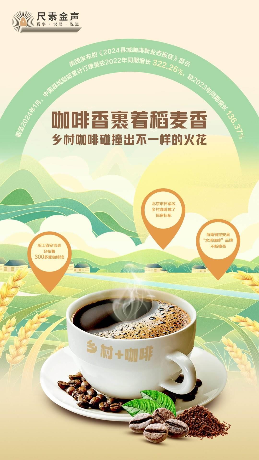 咖啡香裹著稻麥香,吹遍田野?!翱Х?”成為鄉(xiāng)村旅游新業(yè)態(tài)。美團(tuán)發(fā)布的《2024縣城咖啡新業(yè)態(tài)報告》顯示,截至2024年1月,中國縣城咖啡累計訂單量較2022年同期增長322.26%,較2023年同期增長136.37%。鄉(xiāng)村咖啡火出圈,背后靠什么?