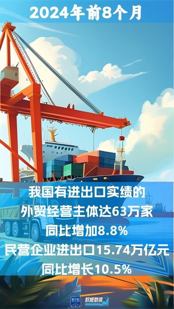 我國外貿(mào)經(jīng)營主體持續(xù)活躍,前8個月有進出口實績的外貿(mào)經(jīng)營主體達63萬家,同比增加8.8%。其中,外貿(mào)主力軍民營企業(yè)進出口15.74萬億元。