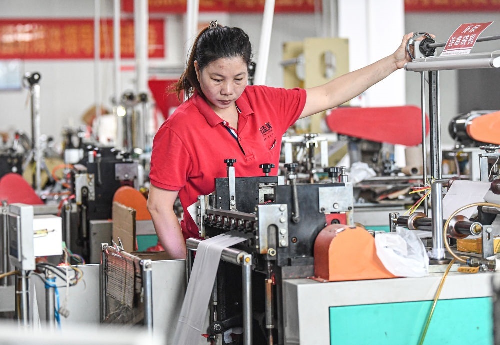 工作人員在海口誠(chéng)佳美塑料包裝有限公司車(chē)間生產(chǎn)全生物降解袋(2020年11月4日攝)。新華社記者 蒲曉旭 攝