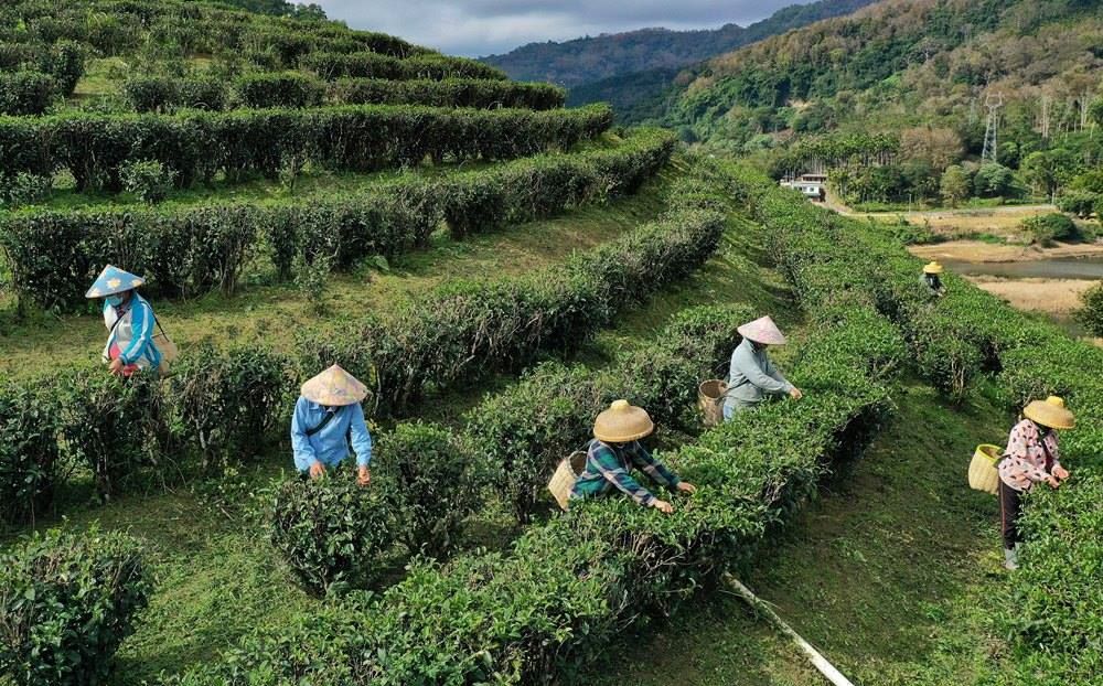 農(nóng)民在五指山椰仙茶園采茶(無(wú)人機(jī)照片,2024年1月11日攝)。新華社記者 郭程 攝