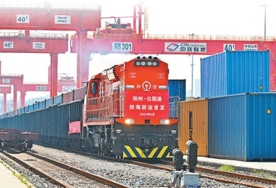 首趟鄭州至日照港鐵海聯(lián)運(yùn)班列從鄭州經(jīng)開區(qū)圃田站啟程。王 瑋攝(影像中國(guó))