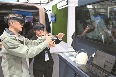 在2024年世界互聯(lián)網(wǎng)大會(huì)“互聯(lián)網(wǎng)之光”博覽會(huì)上,參觀者體驗(yàn)一款全息智能醫(yī)學(xué)影像系統(tǒng)做手術(shù)的過程。新華社記者 蔡湘鑫攝