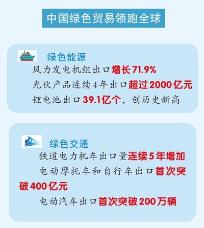 風(fēng)力發(fā)電機組出口增長超七成;光伏產(chǎn)品連續(xù)4年出口超2000億元;鋰電池出口創(chuàng)歷史新高……海關(guān)總署新聞發(fā)言人、統(tǒng)計分析司司長呂大良表示,2024年,中國綠色貿(mào)易領(lǐng)跑全球。中國綠色產(chǎn)品不僅豐富了全球供給,也為全球應(yīng)對氣候變化和綠色低碳轉(zhuǎn)型作出了巨大貢獻。