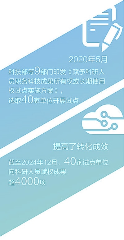 賦權(quán)試點(diǎn)實(shí)施以來,40家試點(diǎn)單位向科研人員賦權(quán)成果超4000項(xiàng)。2023年,以轉(zhuǎn)讓、許可、作價(jià)投資三種方式轉(zhuǎn)化科技成果合同金額達(dá)36.25億元,參與試點(diǎn)的科研人員普遍可獲科技成果轉(zhuǎn)化收益70%以上。僅2023年,試點(diǎn)單位對(duì)科研人員的現(xiàn)金股權(quán)獎(jiǎng)勵(lì)就高達(dá)9.33億元。