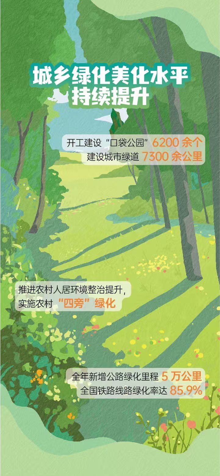 張利明介紹,過去一年,山水林田湖草沙系統(tǒng)治理取得新進展,城鄉(xiāng)綠化美化水平持續(xù)提升。組織實施176個“雙重”工程項目、10個國土綠化示范項目。推進實施“十四五”27個山水林田湖草沙一體化保護和修復工程項目、49個歷史遺留廢棄礦山生態(tài)修復示范工程項目。森林可持續(xù)經(jīng)營實施面積擴大到66.7萬公頃以上。全國林草碳匯試點市(縣)和國有林場碳匯試點實施面積達6.8萬公頃。新增水土流失治理面積6.4萬平方公里。開工建設(shè)“口袋公園”6200余個,建設(shè)城市綠道7300余公里。新增公路綠化里程5萬公里,全國鐵路線路綠化率達85.9%。