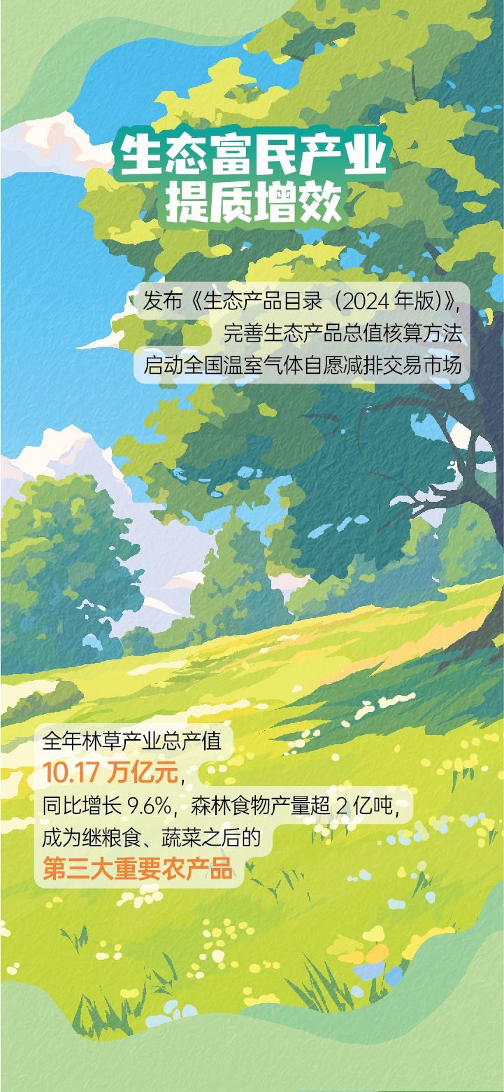 “我們持續(xù)深化改革,推進生態(tài)富民產(chǎn)業(yè)提質(zhì)增效?!睆埨髡f,全年林草產(chǎn)業(yè)總產(chǎn)值10.17萬億元,同比增長9.6%,森林食物產(chǎn)量超2億噸,成為繼糧食、蔬菜之后的第三大重要農(nóng)產(chǎn)品。