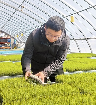 馬巍查看秧苗在生物質(zhì)育苗基質(zhì)上的生長(zhǎng)情況。