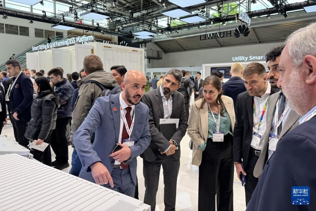 5月7日,參觀者在德國慕尼黑舉行的2025年歐洲國際太陽能展上參觀華為展區(qū)(手機照片)。新華社記者 黃燕 攝