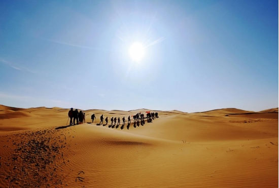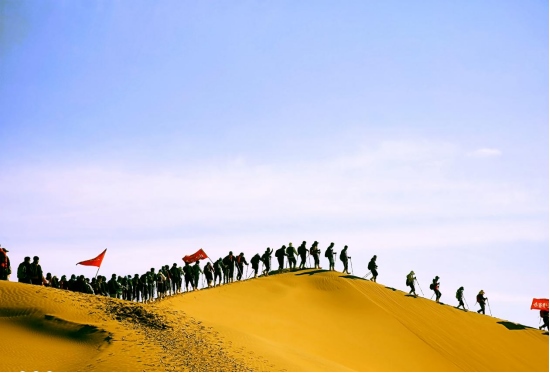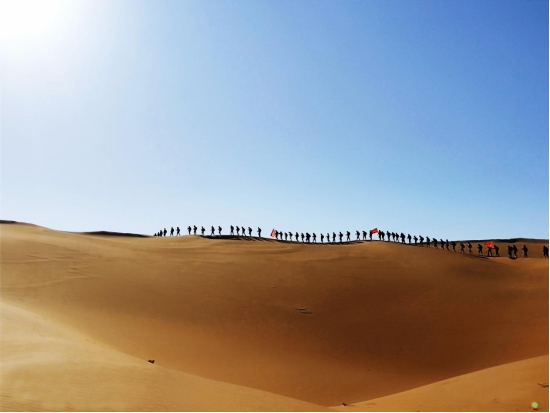 4月8日,內(nèi)蒙古鄂爾多斯杭錦旗境內(nèi)的庫布其沙漠,一隊游客正在沙漠中穿沙。