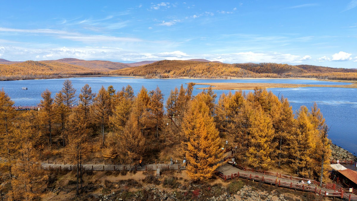 9月29日,游客在內(nèi)蒙古阿爾山國家森林公園烏蘇浪子湖邊打卡 北疆新聞記者 張楊攝影