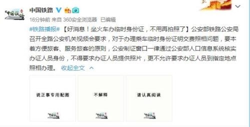4月19日,《新華每日電訊》刊登《辦臨時身份證坐火車,非得拍照證明自己是自己?》引起社會廣泛關(guān)注。公安部鐵路公安局有關(guān)負責人回應(yīng)稱,已要求所有辦證單位和人員不得再要求辦證人員提供照片。